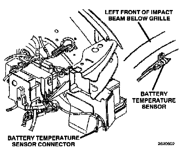 Left Front Of Impact Beam Below Grille, Battery Temperature Sensor, Battery Temperature Sensor Connector: