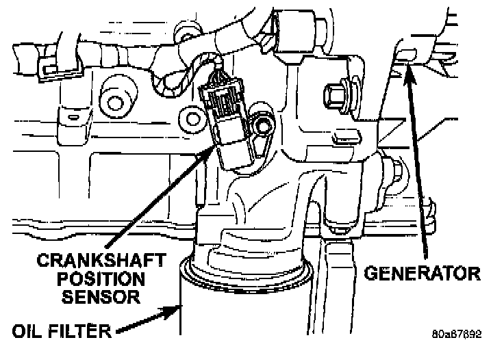 The crankshaft position sensor mounts to the engine block behind the generator, just above the oil filter.
