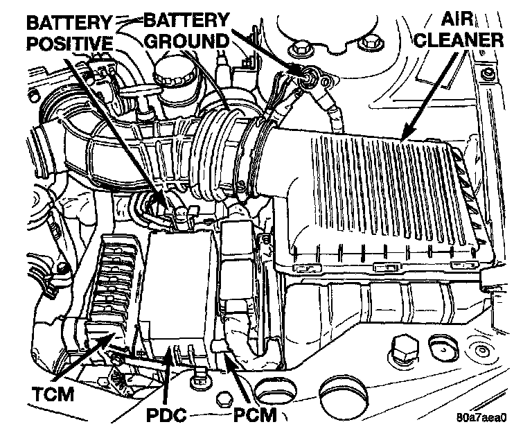 The ASD relay and fuel pump relay are located in the Power Distribution Center (PDC) near the Air Cleaner. The inside top of the PDC cover has a label showing relay and fuse location.