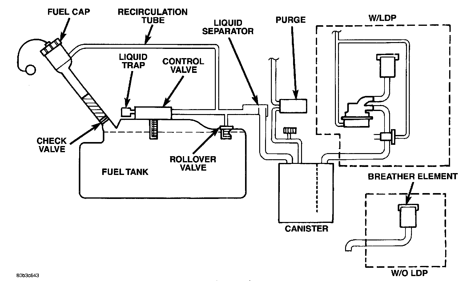 The check valves are one-way valves. The first check valve is used to draw outside air into the lower chamber of the LDP (the space that is below the pump diaphragm). The second check valve is used to vent this outside air, which has become pressurized from the fall of the pump diaphragm, into the evaporative system.
