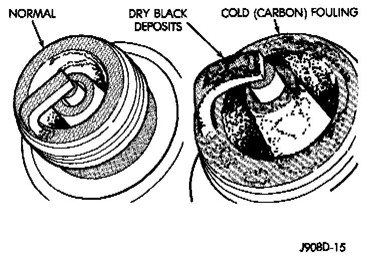 Cold fouling is normal after short operating periods. The spark plugs do not reach a high enough operating temperature during short operating periods. Replace carbon fouled plugs with new spark plugs.