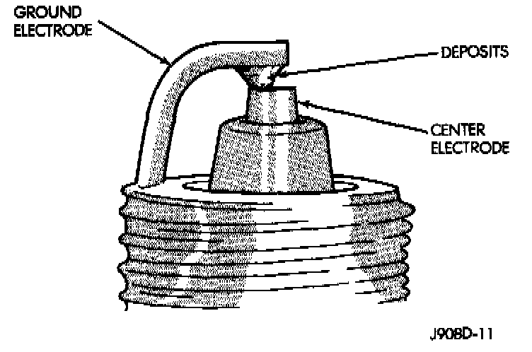 Loose deposits in the combustion chamber can cause electrode gap bridging. The deposits accumulate on the spark plugs during continuous stop-and-go driving. When the engine is suddenly subjected to a high torque load, the deposits partially liquefy and bridge the gap between the electrodes. This short circuits the electrodes. Spark plugs with electrode gap bridging can be cleaned and reused.