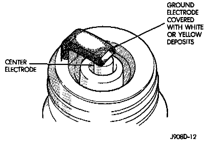 Fuel scavenger deposits may be either white or yellow. They may appear to be harmful, but are a normal condition caused by chemical additives in certain fuels. These additives are designed to change the chemical nature of deposits and decrease spark plug misfire tendencies. Notice that accumulation on the ground electrode and shell area may be heavy but the deposits are easily removed. Spark plugs with scavenger deposits can be considered normal in condition, cleaned and reused.