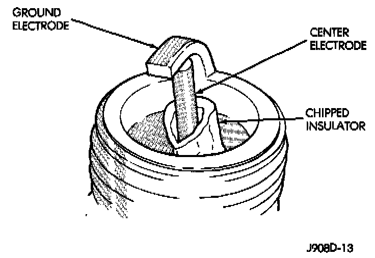 A chipped electrode insulator usually results from bending the center electrode while adjusting the spark plug electrode gap. Under certain conditions, severe detonation also can separate the insulator from the center electrode. Spark plugs with chipped electrode insulators must be replaced.