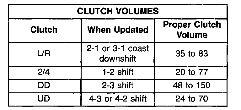 Certain mechanical problems within the input clutch assembly (broken return springs, out of position snap rings, excessive clutch pack clearance, improper assembly, etc.) can cause inadequate or out-of-range element volumes. Also, defective Input/Output Speed Sensors and wiring can cause these conditions. The following chart identifies the appropriate clutch volumes and when they are monitored/ updated: