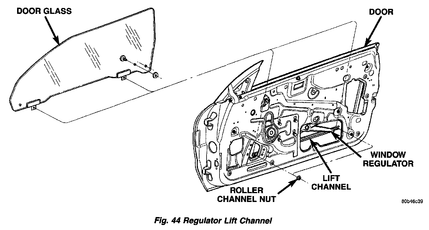 3. Remove nuts attaching regulator lift channel to door glass.