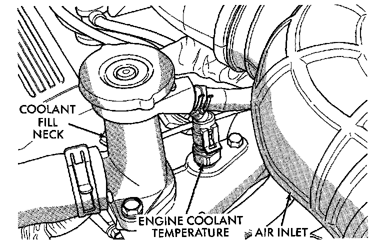 The coolant sensor threads next to the coolant fill neck.