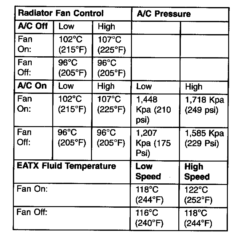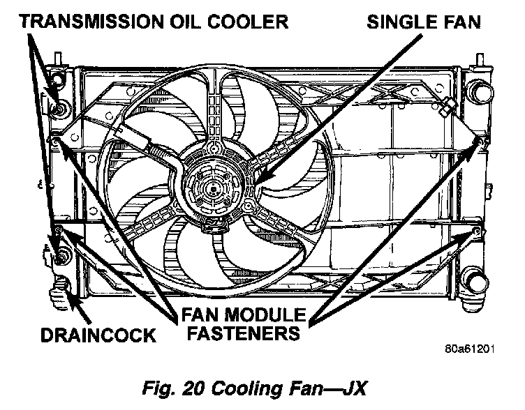 The radiator has a single cooling fan, with a two speed motor. The fan is controlled by the Powertrain Control Module (PCM) which energizes the fan relay. Fan operation is accomplished three ways: