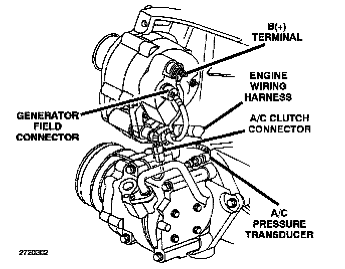 Generator Field Connector, B(+) Terminal, Engine Wiring Harness, A/C Clutch Connector, A/C Pressure Transducer: