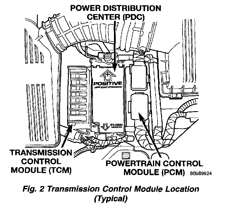 The Transmission Control Module (TCM) is located in the engine compartment on the left (driver's) side next to the Power Distribution Center (PDC) (Fig. 2).