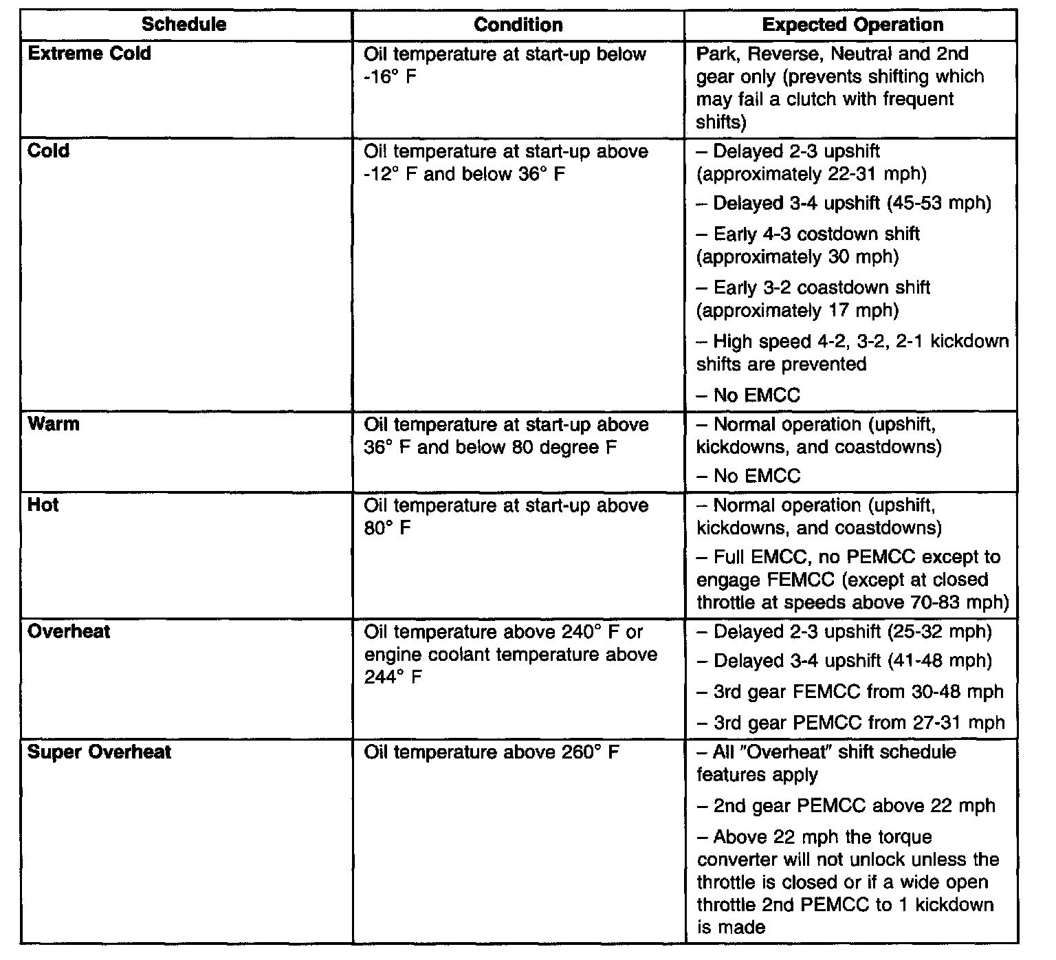 As driving conditions change, the TCM appropriately adjusts the shift schedule. Refer to the above chart to determine the appropriate operation expected, depending on driving conditions.