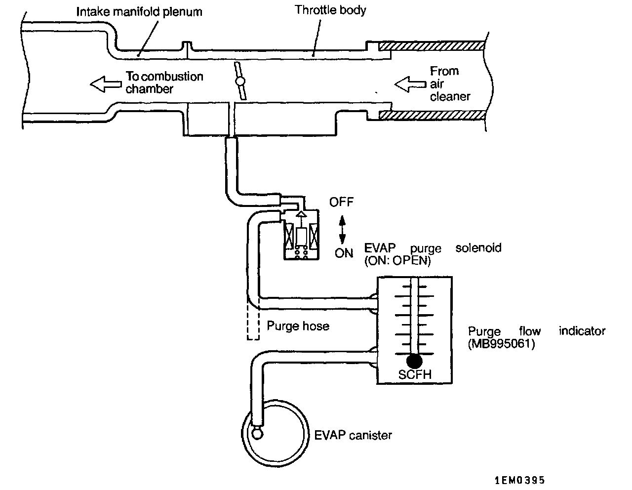 1. Disconnect the purge hose from the evaporative emission (EVAP) canister, and connect the special tool (purge flow indicator) between the EVAP canister and the purge hose.