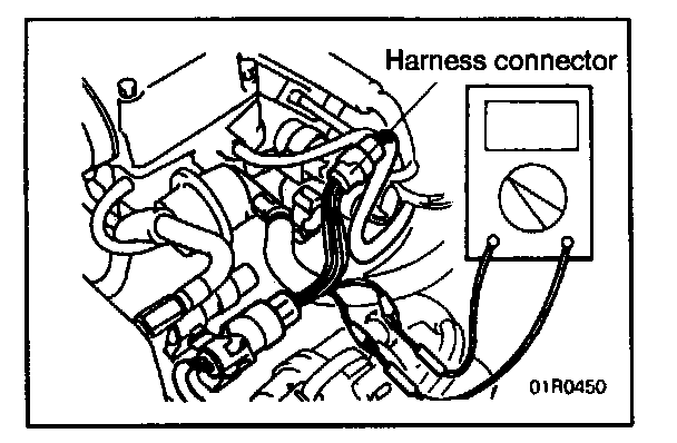 Caution: At this time, be careful not to short the connector pins with the test probes. To do so may damage the circuits inside the ECU.