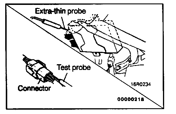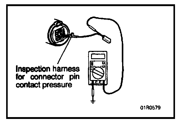 Use the special tool (inspection harness for connector pin contact pressure in the harness set for inspection). The inspection harness for connector pin contact pressure should be used. The test probe should never be forcibly inserted, as it may cause a defective contact.