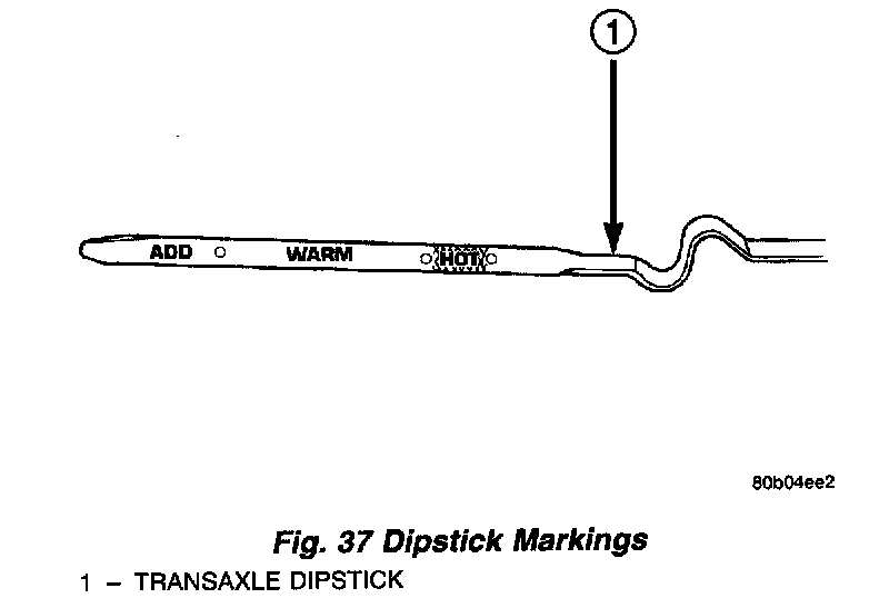 The torque converter fills in both the P Park and N Neutral positions. Place the selector lever in P Park to be sure that the fluid level check is accurate. The engine should be running at idle speed for at least one minute, with the vehicle on level ground. At normal operating temperature (approximately 82 ° C. or 180 ° F.), the fluid level is correct if it is in the HOT region (cross-hatched area) on the oil level indicator (Fig. 37). The fluid level will be approximately one-quarter inch above the lower hole of the dipstick at 70 ° F fluid temperature.