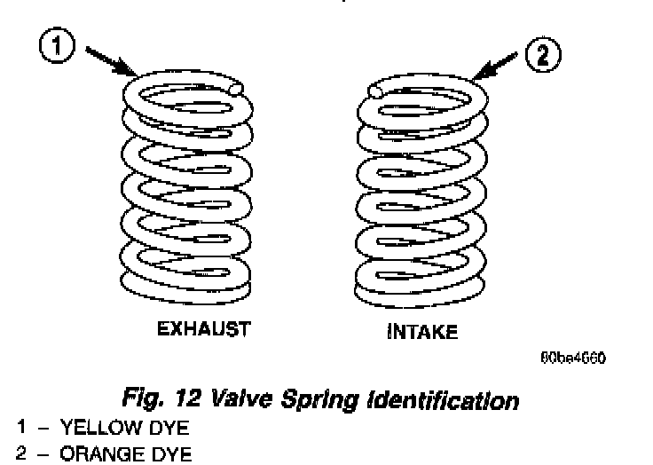 The valve springs are of two different lengths and are wound in different directions. The valve springs are color coded: the intake spring has a right hand coil direction with orange dye on the top coils and the exhaust spring has a left hand coil direction with yellow dye on the top coils (Fig. 12).