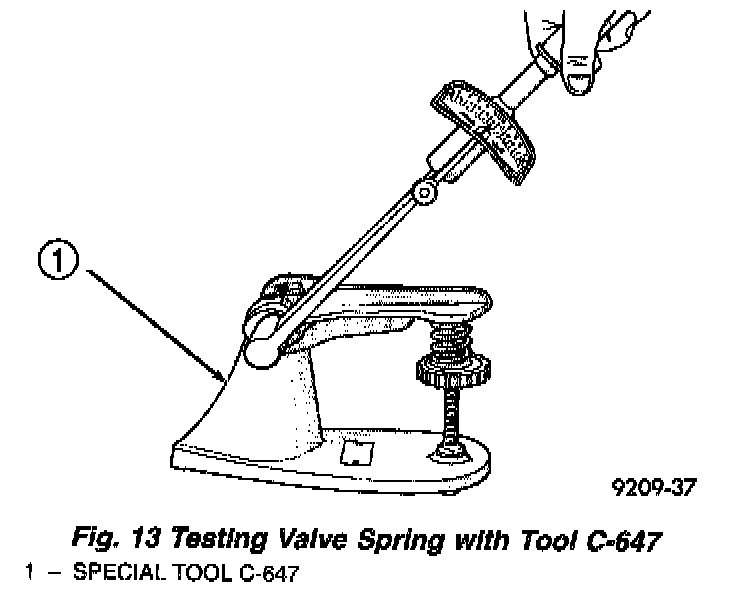 When valves have been removed for inspection, reconditioning or replacement, valve springs should be tested (Fig. 13). As an example; the compression length of the spring to be tested is 38.00 mm (1.496 inch). Turn table of Tool C-647 until surface is in line with the 38.00 mm (1.496 inches.) mark on the threaded stud and the zero mark on the front. Place spring over stud on the table and lift compressing lever to set tone device. Pull on torque wrench until ping is heard. Take reading on torque wrench at this instant. Multiply this reading by two. This will give the spring load at test length. Fractional measurements are indicated on the table for finer adjustments. Refer to Valve Spring; Specifications to obtain specified height and allowable tensions. Replace springs that do not meet specifications.