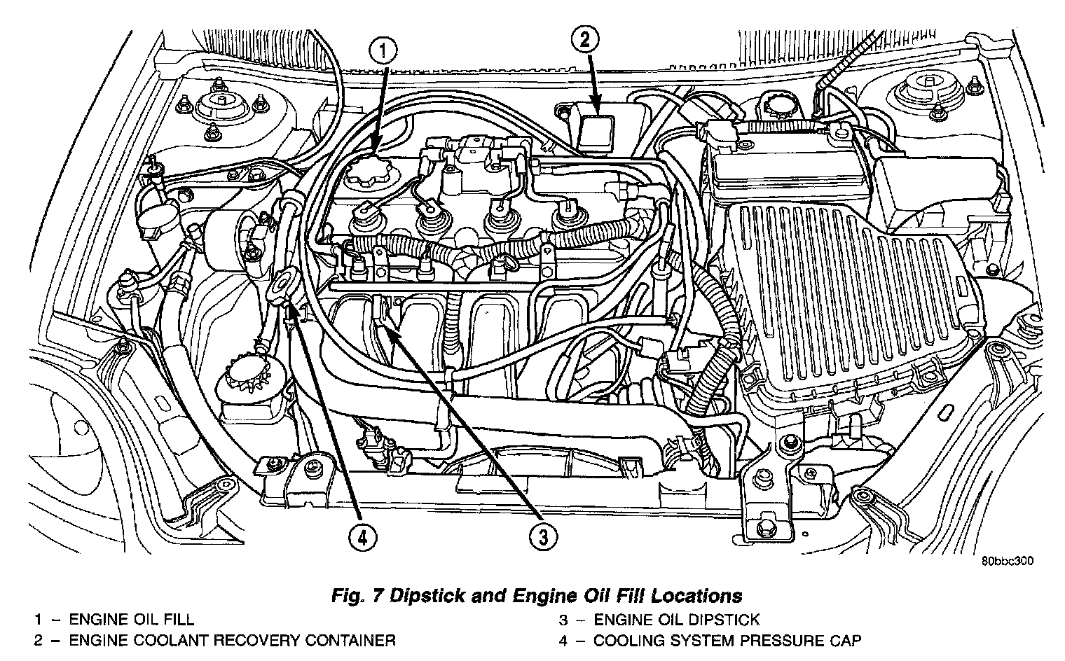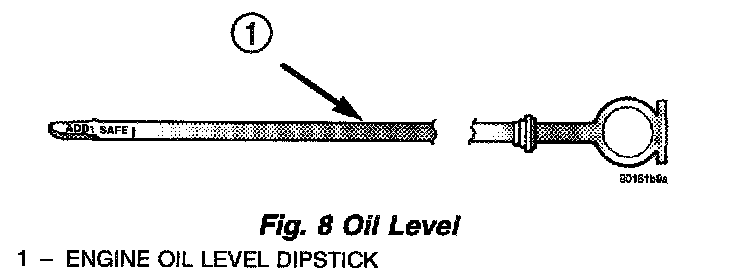 Checking the oil while the vehicle is on level ground will improve the accuracy of the oil level reading. Remove dipstick (Fig. 7) and observe oil level. Add oil only when the level is at or below the ADD mark (Fig. 8).