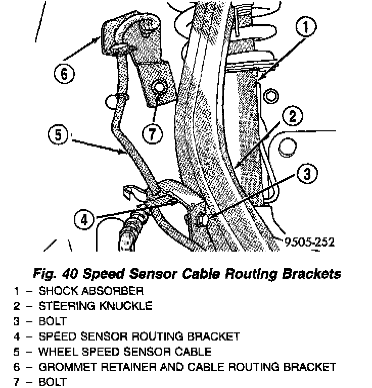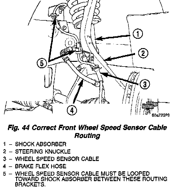 CAUTION: When installing the wheel speed sensor cable routing bracket on the steering knuckle, the speed sensor cable must be looped toward the shock absorber as shown. If speed sensor cable is not routed in this direction it will rub against the tire or wheel, damaging the speed sensor cable.