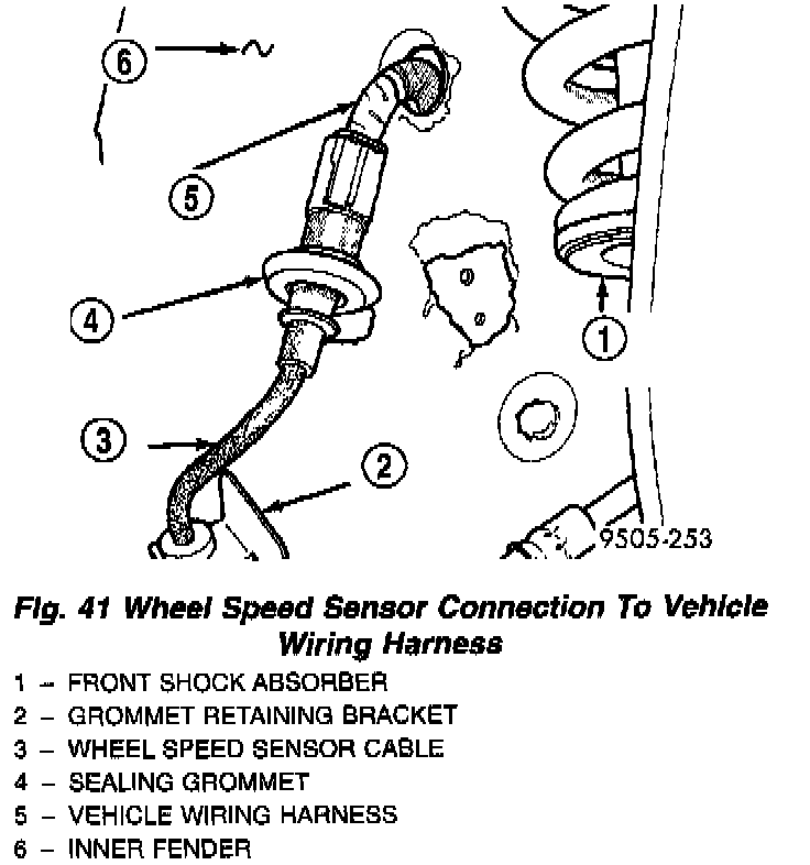 4. Remove speed sensor sealing grommet from the inner fender. Then unplug the speed sensor cable from the vehicle wiring harness.