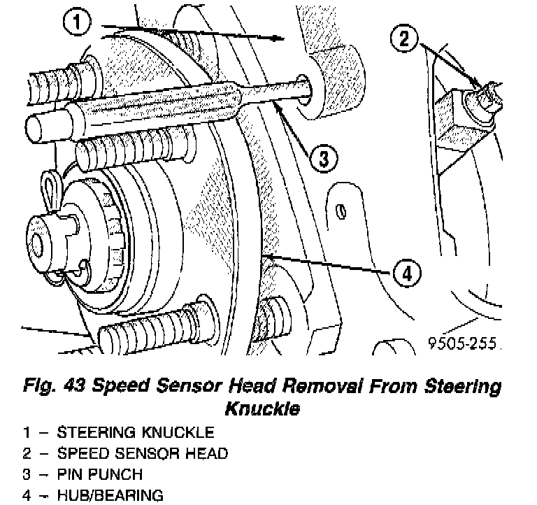 6. If speed sensor head can not be removed from steering knuckle by hand, the locating pin on the speed sensor head has seized to the steering knuckle do to corrosion. Remove speed sensor head from steering knuckle using the following procedure. Remove disc brake caliper from steering knuckle, and remove brake rotor from hub/bearing assembly. Then insert a pin punch through hole in front steering knuckle and tap speed sensor head locating pin out of steering knuckle.