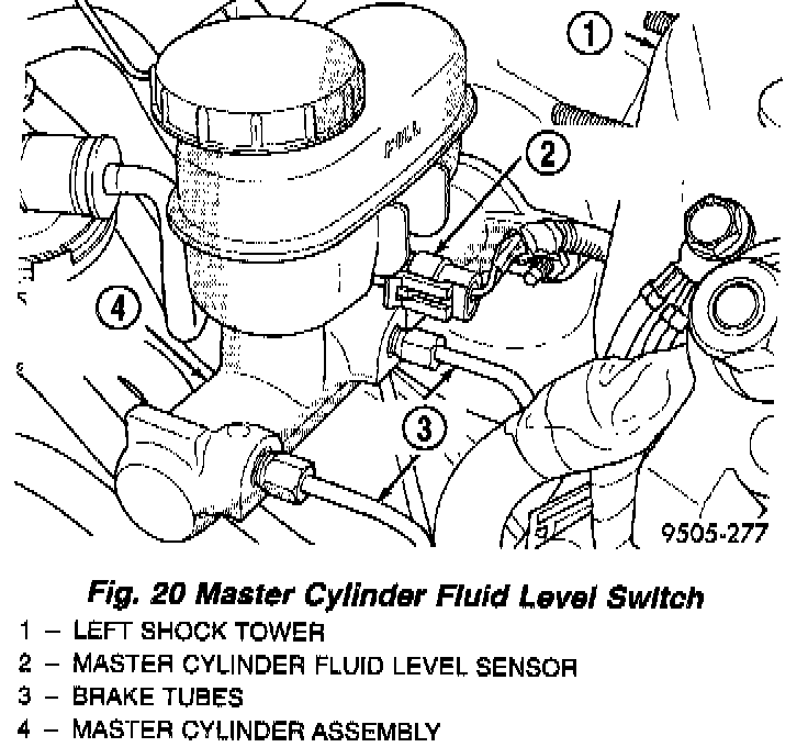 DESCRIPTIONThe brake fluid level switch is located in the brake fluid reservoir of the master cylinder assembly. The purpose of the sensor is to provide the driver with an early warning that brake fluid level in master cylinder reservoir has dropped to below normal. This may indicate an abnormal loss of brake fluid in the master cylinder fluid reservoir resulting from a leak in the hydraulic system.