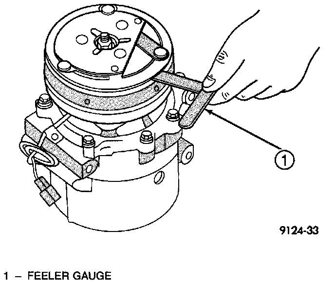 8. With the front clutch plate assembly tight against the shims, measure the air gap between clutch plate and pulley face with feeler gauges. The air gap should be between 0.35 and 0.65 mm (0.013 and 0.025 inch). If proper air gap is not obtained, add or subtract shims until desired air gap is obtained.