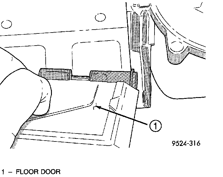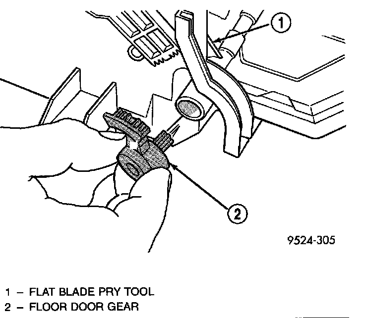 28. From the panel door air opening, using a long thin screwdriver, push in clip for floor door gear. Remove floor door gear.