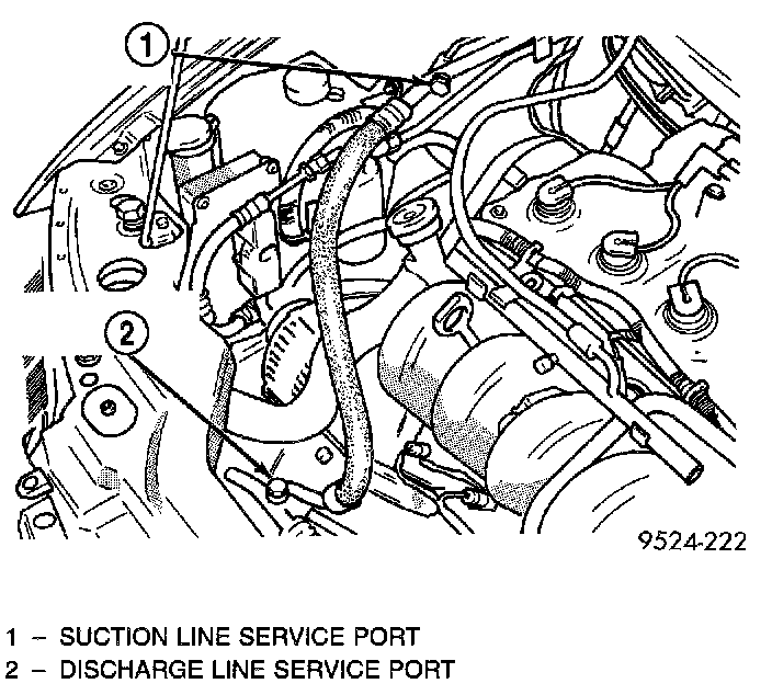Both of the service ports to charge the air conditioning system are located on the hoses. New design of service ports have been used to ensure that the system is not accidentally filled with the wrong refrigerant (R-12).