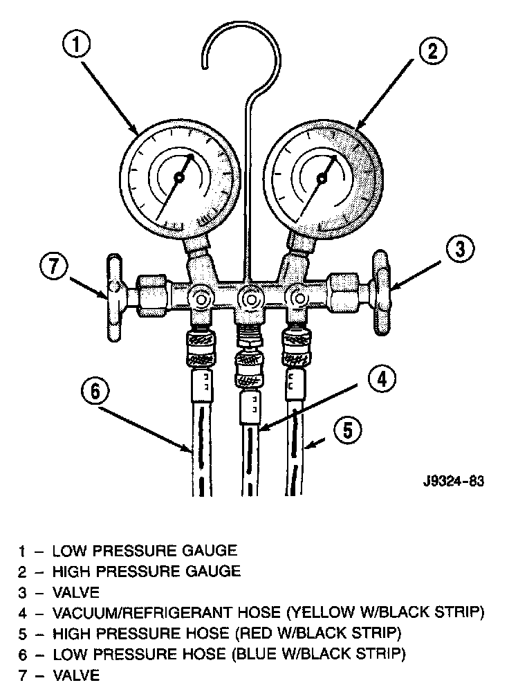 A manifold gauge set must also be used in conjunction with the charging and/or recovery/recycling device. Only use gauges that have not been used for R-12. The service hoses on the gauge set should have manual (turn wheel) or automatic back flow valves at the service port connector ends. This will prevent refrigerant R-134a from being released into the atmosphere.