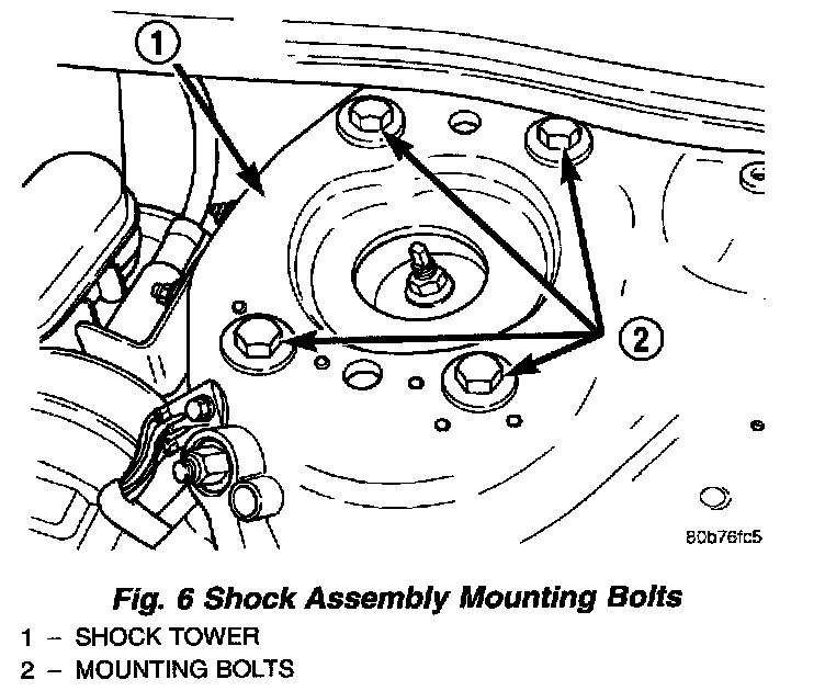 3. Loosen the shock assembly mounting bolts on the side marked in step 1. Loosen the bolts enough to allow adequate space for removal of the plastic locating pins that align the upper mounting bracket with the shock tower.