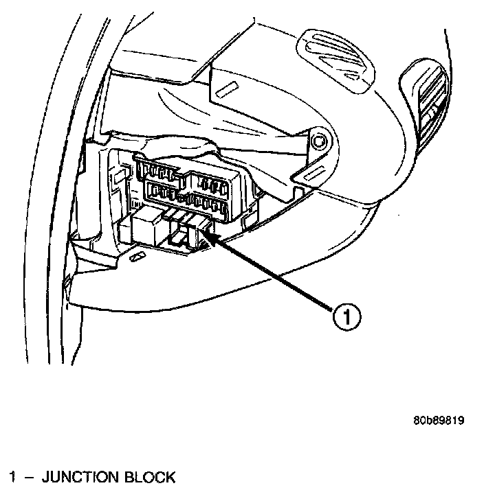 An electrical Junction Block (JB) is located in the left endcap of the instrument panel. The JB combines the functions previously provided by a separate fuseblock module and relay center. It also serves to simplify and centralize numerous electrical components, as well as to distribute electrical current to many of the accessory systems in the vehicle. It eliminates the need for numerous splice connections and serves in place of a bulkhead connector between many of the engine compartment, instrument panel, and body wire harnesses.