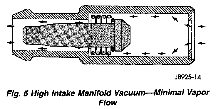 When the engine is at idle or cruising, high manifold vacuum is present. At these times manifold vacuum is able to completely compress the spring and pull the plunger to the top of the valve. In this position there is minimal vapor flow through the valve.