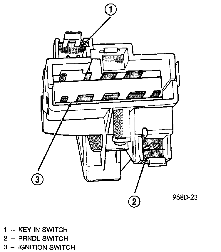 The ignition switch attaches to the lock cylinder housing on the end opposite the lock cylinder. For ignition switch terminal and circuit identification.