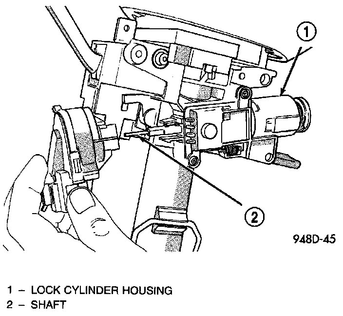 12. Place key cylinder in RUN position. Depress lock cylinder retaining tab and remove key cylinder.