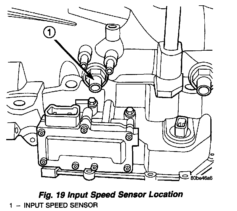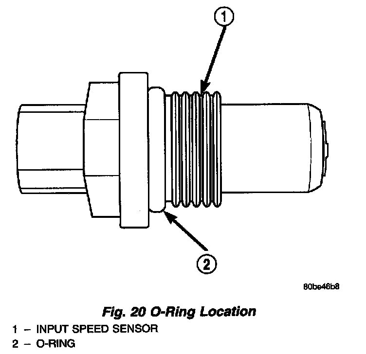 The Input Speed Sensor is a two-wire magnetic pickup device that generates AC signals as rotation occurs. It is threaded into the transaxle case (Fig. 19), sealed with an O-ring (Fig. 20), and is considered a primary input to the Transmission Control Module (TCM).