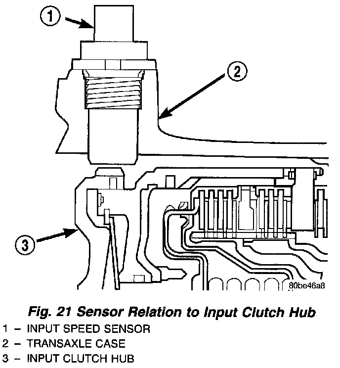 The Input Speed Sensor provides information on how fast the input shaft is rotating. As the teeth of the input clutch hub pass by the sensor coil (Fig. 21), an AC voltage is generated and sent to the TCM. The TCM interprets this information as input shaft rpm.