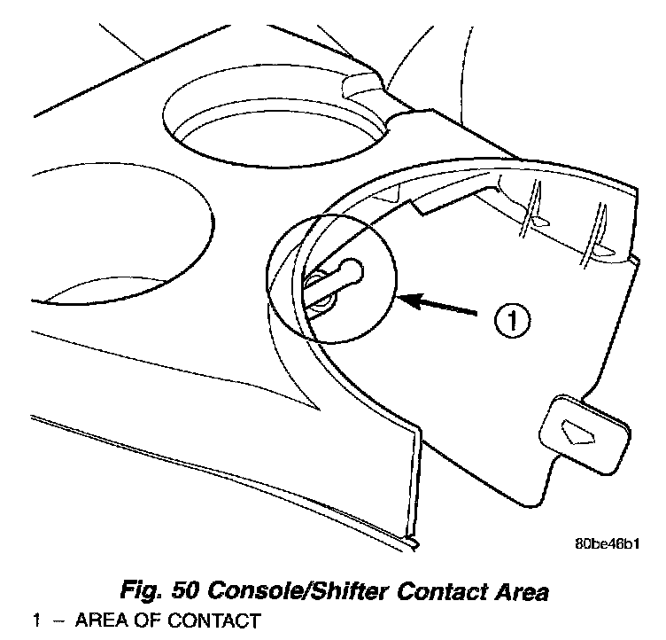CAUTION: When installing forward console, the console will contact nylon shift release plunger (Fig. 50). If care is not used, plunger may break, requiring shifter assembly replacement.