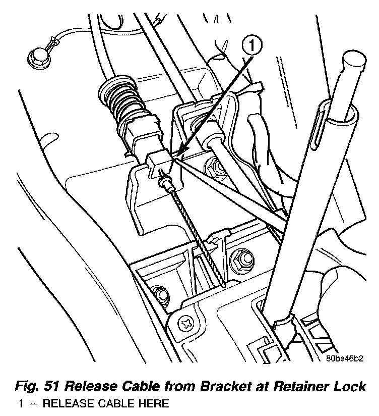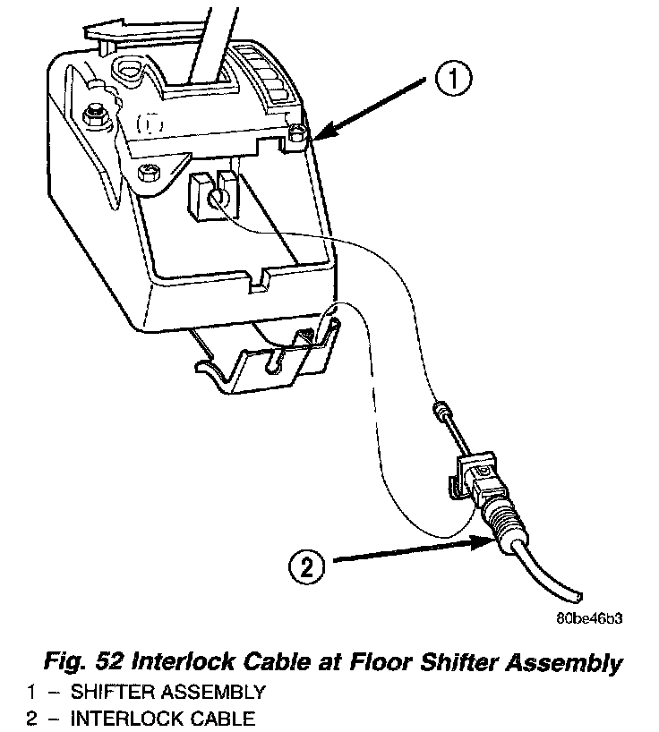 5. Release interlock cable adjuster end by inserting pointed object into shift bracket to disengage lock (Fig. 51). Unsnap the shifter/ignition interlock cable adjuster end from the slot in the gearshift mechanism bracket and disconnect cable core from shifter assembly (Fig. 52).