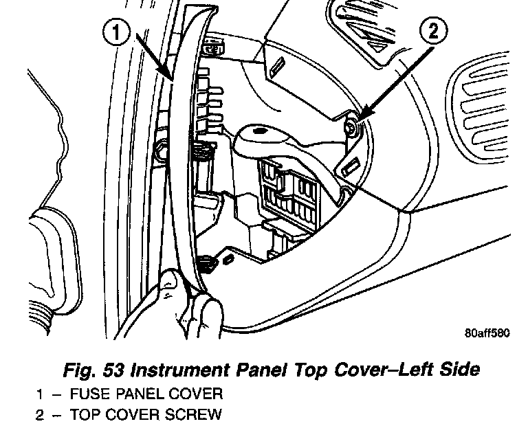 6. Remove fuse panel cover from left end of instrument panel. Remove screw holding end of instrument panel top cover (Fig. 53).