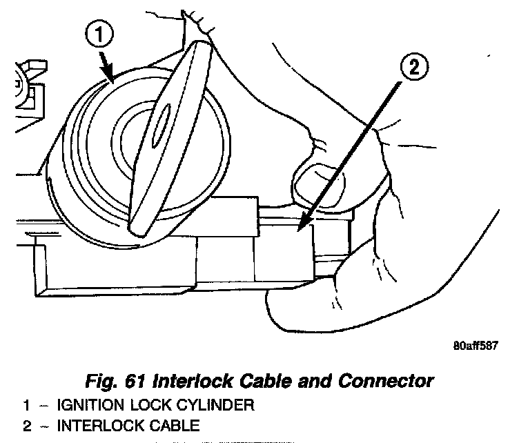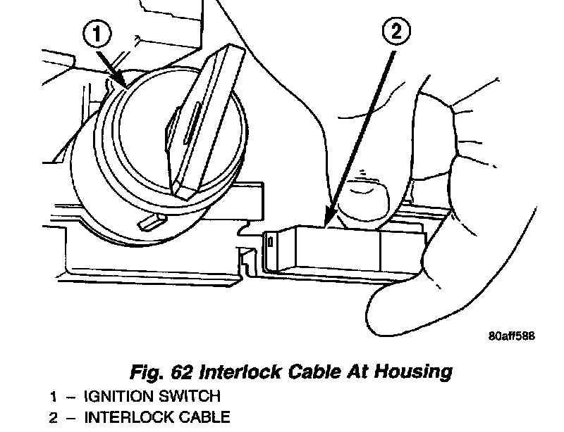 3. Install the interlock cable into the interlock housing at the steering column (Fig. 62). Verify the cable snaps into the housing.