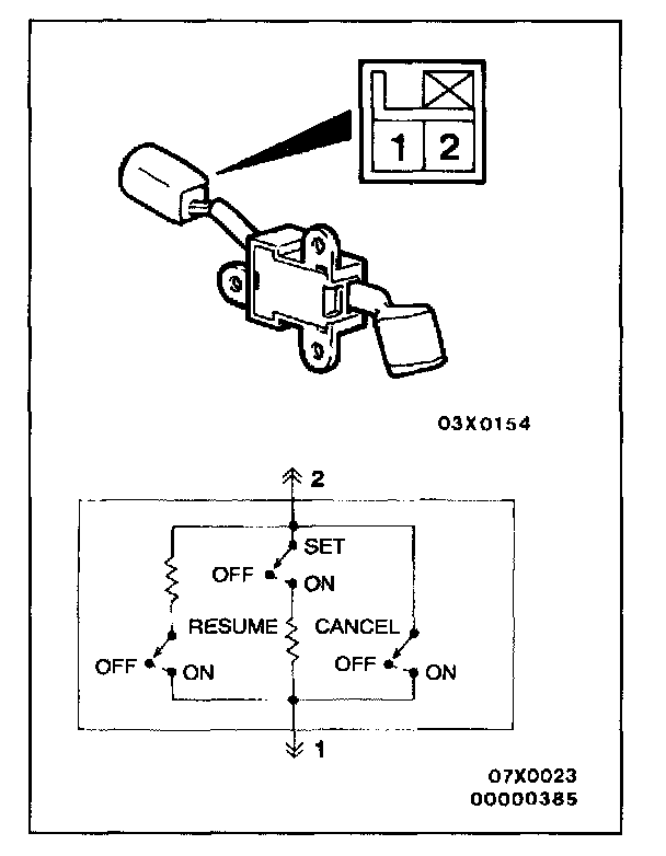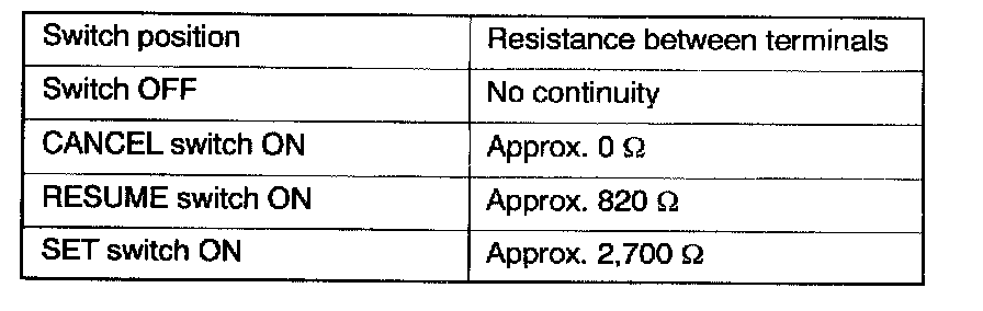 Measure the resistance between the terminals when each of the SET, RESUME and CANCEL switches is pressed.