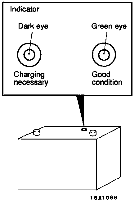 The battery contains a visual test indicator which gives a green signal when an adequate charge level exists, and a dark signal when charging is required.