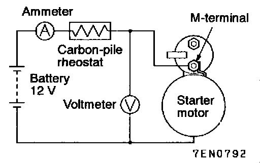 2. Connect a test ammeter (100 ampere scale) and carbon pile rheostat in series between the positive battery terminal and starter motor terminal.