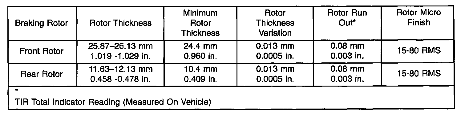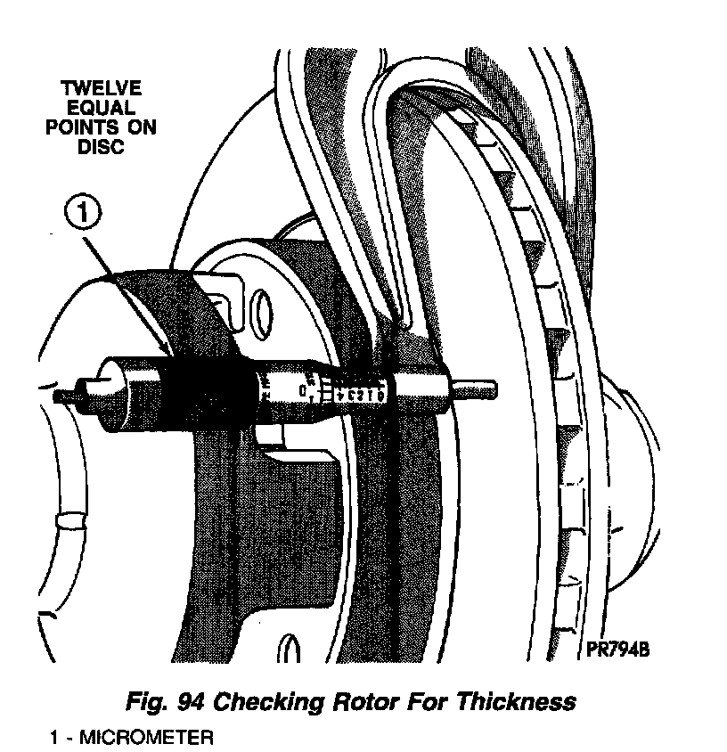 Rotor thickness variation measurements should be made in conjunction with measuring runout. Measure thickness of the brake rotor at 12 equal points around the rotor braking surface with a micrometer at a radius approximately 25 mm (1 inch) from edge of rotor. If thickness measurements vary by more than 0.013 mm (0.0005 inch), the rotor should refaced or replaced.