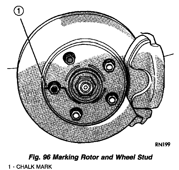If the hub runout does not exceed this specification, install the rotor back on the hub, aligning the chalk marks on the rotor with a wheel mounting stud, two studs apart from the original stud. Tighten nuts in the proper sequence and torque to specifications.
