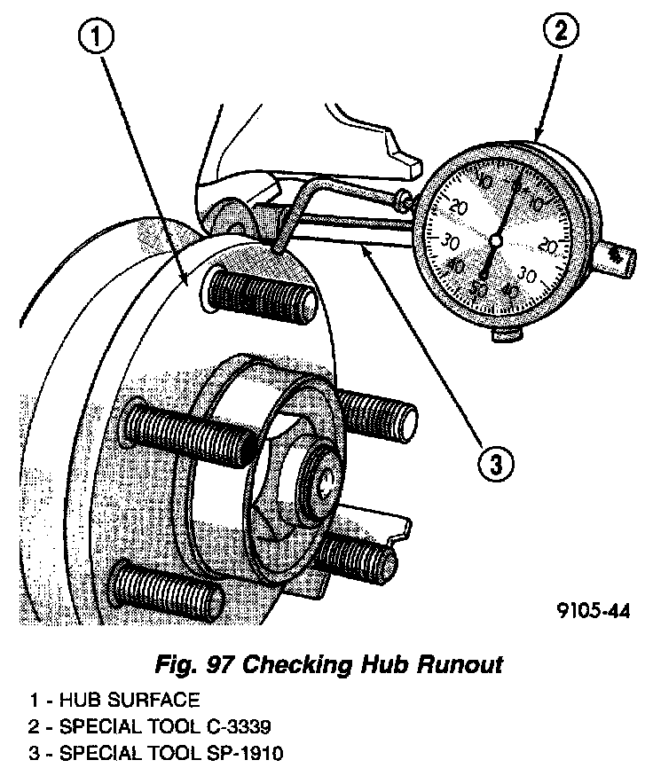 On-vehicle rotor runout is the combination of the individual runout of the hub face and the runout of the rotor. (The hub and rotor runouts are separable). The measure rotor runout on the vehicle, first remove the tire and wheel assembly. Reinstall the wheel mounting nuts on the studs, tightening the rotor to the hub. Mount the Dial Indicator, Special Tool C-3339, with Mounting Adaptor, Special Tool SP1910 on steering arm. The dial indicator plunger should contact braking surface of rotor approximately 25 mm (one inch) from outer edge of rotor. Check lateral runout on both sides of the rotor, marking the low and high spots on both. Runout limits can be found in the table at the end of this brake rotor information.