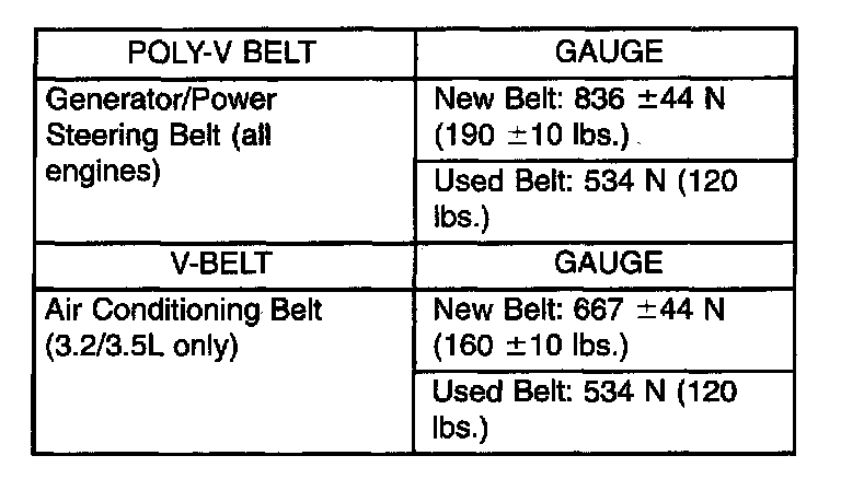 Use belt tension gauge, Special Tool 7198 for conventional V-belts and Poly-V belts.