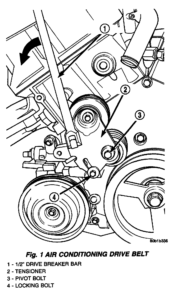 3. Insert 1/2" drive breaker bar into square opening on belt tensioner. Rotate tensioner counterclockwise until belt can be removed from pulleys (Fig. 1).