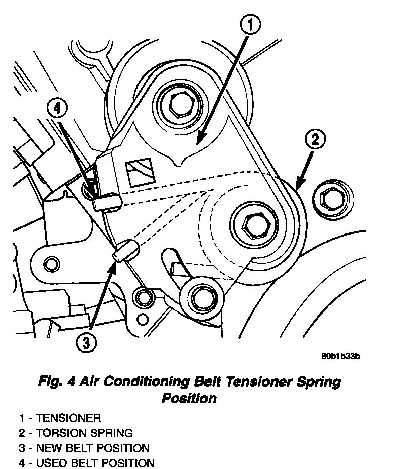 NOTE: Verify that torsion spring position is in the new belt position before installing a NEW belt (Fig. 4). If torsion spring is not in the new belt position, follow steps 1 - 7 to change the tensioner spring from the USED belt position to the NEW belt position.